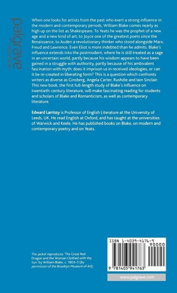 William Blake is one of the most important influences on twentieth-century literature. This study will ask why he is a figure central to the Modernist re-definition of past art. He also appears to be an acceptable sage for postmodernists, he can be associated with an opposition to authority without imposing one version of his own mythology.