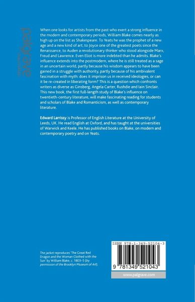 William Blake is one of the most important influences on twentieth-century literature. This study will ask why he is a figure central to the Modernist re-definition of past art. He also appears to be an acceptable sage for postmodernists, he can be associated with an opposition to authority without imposing one version of his own mythology.