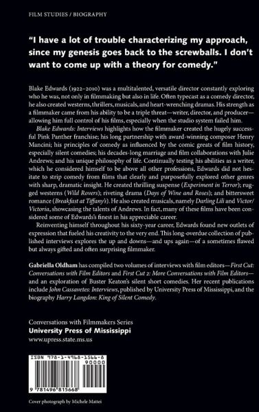 Blake Edwards (1922-2010) was a multitalented, versatile director constantly exploring who he was, not only in filmmaking but also in life. Often typecast as a comedy director, he also created westerns, thrillers, musicals, and heart-wrenching dramas. His strength as a filmmaker came from his ability to be a triple threat--writer, director, and producer--allowing him full control of his films, especially when the studio system failed him. Blake Edwards: Interviews highlights how the filmmaker created the hugely successful Pink Panther franchise; his long partnership with award-winning composer Henry Mancini; his principles of comedy as influenced by the comic greats of film history, especially silent comedies; his decades-long marriage and film collaborations with Julie Andrews; and his unique philosophy of life. Continually testing his abilities as a writer, which he considered himself to be above all other professions, Edwards did not hesitate to strip comedy from films that clearly and purposefully explored other genres with sharp, dramatic insight. He created thrilling suspense (Experiment in Terror); rugged westerns (Wild Rovers); riveting drama (Days of Wine and Roses); and bittersweet romance (Breakfast at Tiffany's). He also created musicals, namely Darling Lili and Victor/Victoria, showcasing the talents of Andrews. In fact, many of these films have been considered some of Edwards's finest in his appreciable career. Reinventing himself throughout his sixty-year career, Edwards found new outlets of expression that fueled his creativity to the very end. This long-overdue collection of published interviews explores the up and downs--and ups again--of a sometimes flawed but always gifted and often surprising filmmaker.