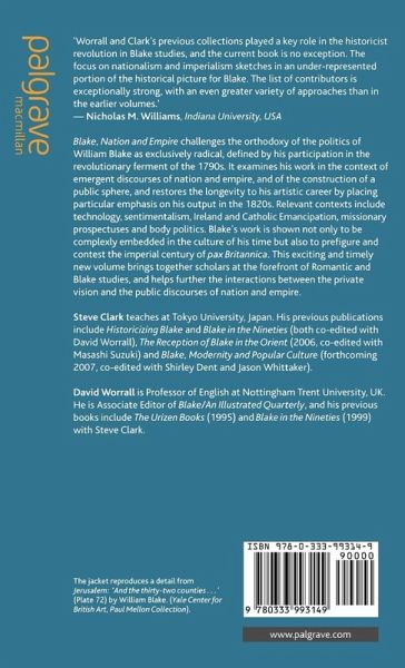 List of Illustrations Preface Notes on the Contributors Abbreviations Introduction; S.Clark & D.Worrall Immortal Joy: William Blake and the Cultural Politics of Empire; S.Makdisi Thel in Africa; D.Worrall Bloody Blake: Nation and Circulation; J.Mee Blake, Hayley and the History of Sexuality; S.Matthews Blake and the Syntax of Sentiment: An essay on 'Blaking' Understanding; J.Chandler National Arts and Disruptive Technologies in Blake's Prospectus of 1793; M.Eaves 'What is Liberty without Universal Toleration': Blake Homosexuality and the Cooperative Commonwealth; C.Z.Hobson Restoring the Nation: Blake and the Aftermyth of Revolution; A.Lincoln Jerusalem as Imperial Prophecy; S.Clark The Matter of Britain: Blake, Milton and the Ancient Britons; J.Whittaker Erin, Ireland, and the Emanation in Blake's Jerusalem ; R.N.Essick Blake After Blake: A Nation Discovers Genius; J.Viscomi Blake Bibliography Index