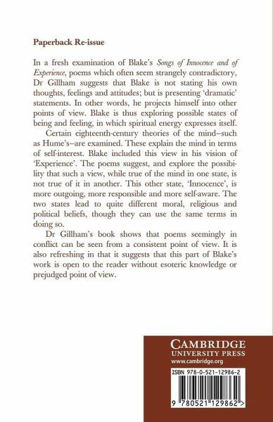 In a fresh examination of Blake's Songs of Innocence and Experience, poems which often seem strangely contradictory, Dr Gillham suggests that Blake is not stating his own thoughts and feelings but presenting 'dramatic' statements; he projects himself into other points of view, thus exploring possible states of being and feeling in which spiritual energy expresses itself. Certain eighteenth-century theories of the mind are examines, explaining the mind in terms of self-interest. Blake included this view in his vision of 'Experience'. The poems suggest, and explore the possibility that such a view, while true of the mind in one state, is not true of it in another. This other state, 'Innocence', is more outgoing, more responsible and more self-aware. The two states lead to quite different moral, religious and political beliefs, though they can use the same terms in doing so. Dr Gillham shows that poems seemingly in conflict can be seen from a consistent point of view.