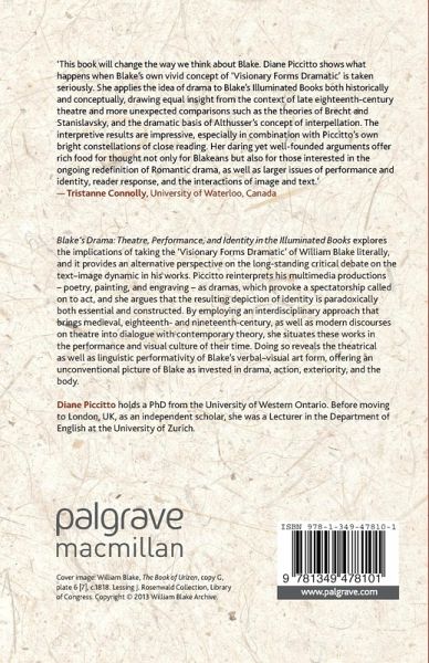 "This book will change the way we think about Blake. Diane Piccitto shows what happens when Blake's own vivid concept of 'Visionary Forms Dramatic' is taken seriously. She applies the idea of drama to Blake's illuminated books both historically and conceptually, drawing equal insight from the context of late eighteenth-century theatre and more unexpected comparisons such as the theories of Brecht and Stanislavsky, and the dramatic basis of Althusser's concept of interpellation. The interpretive results are impressive, especially in combination with Piccitto's own bright constellations of close reading. Her daring yet well founded arguments offer rich food for thought not only for Blakeans but also for those interested in the ongoing redefinition of Romantic drama, as well as larger issues of performance and identity, reader response, and the interactions of image and text." Tristanne Connolly, University of Waterloo, Canada