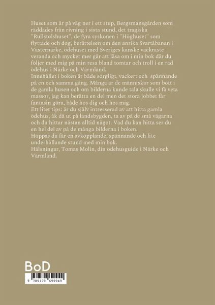 Huset som är på väg ner i ett stup, Bergsmansgården som räddades från rivning i sista stund, det tragiska "Rullstolshuset", de fyra syskonen i "Höghuset" som flyttade och dog, berättelsen om den anrika Svartåbanan i Västernärke, ödehuset med kanske Sveriges vackraste veranda och mycket mer går att läsa om i min bok där du följer med mig på min resa bland tomtar och troll i en rad ödehus i Närke och Värmland. Innehållet i boken är både sorgligt, vackert och spännande på en och samma gång. Många är de människor som bott i de gamla husen och om bilderna kunde tala skulle vi få veta massor, jag kan berätta en del men det stora jobbet får fantasin göra, både hos dig och hos mig. Ett litet tips: är du själv intresserad av att hitta gamla ödehus, åk ut på landsbygden, ta av på de små vägarna och du hittar nästan alltid något. Vad du kan hitta ser du en hel del av på de många bilderna i boken. Hoppas du får en avkopplande, spännande och lite underhållande stund med min bok. Hälsningar, Tomas Molin, din ödehusguide i Närke och Värmland.