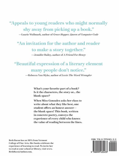 When teacher Miss Gonzalez asks her class to write about their favorite part of any book, one student answers honestly: the blank space! This story, written in concrete poetry, conveys the experience of many striving readers. The elegant design, lyrical language, and abundant blank space offer striving readers lots of time to co-create the story. Blank Space by Beth Bacon is a simple yet powerful exploration of the act of reading. Where exactly does reading happen? It must happen somewhere between the words on the page and the reader's heart and mind. The themes in this easy-to-read story can aid teachers, reading specialists, and librarians and spark discussions on reading strategies. Children who are reluctant to read will see themselves in this hi-lo book for intermediate readers. Like Beth Bacon's other books, I Hate Reading, The Book No One Wants To Read, and The Worst Book Ever, this book validates the experience of today's striving readers.