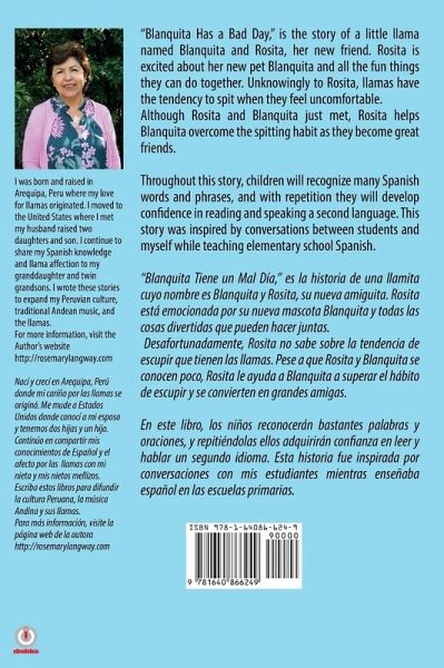"Blanquita Has a Bad Day," is the story of a little llama named Blanquita and Rosita, her new friend. Rosita is excited about her new pet Blanquita and all the fun things they can do together. Unknowingly to Rosita, llamas have the tendency to spit when they feel uncomfortable. Although Rosita and Blanquita just met, Rosita helps Blanquita overcome the spitting habit as they become great friends. Throughout this story, children will recognize many Spanish words and phrases, and with repetition they will develop confidence in reading and speaking a second language. This story was inspired by conversations between students and myself while teaching elementary school Spanish. "Blanquita Tiene un Mal Día," es la historia de una llamita cuyo nombre es Blanquita y Rosita, su nueva amiguita. Rosita está emocionada por su nueva mascota Blanquita y todas las cosas divertidas que pueden hacer juntas. Desafortunadamente, Rosita no sabe sobre la tendencia de escupir que tienen las llamas. Pese a que Rosita y Blanquita se conocen poco, Rosita le ayuda a Blanquita a superar el hábito de escupir y se convierten en grandes amigas. En este libro, los niños reconocerán bastantes palabras y oraciones, y repitiéndolas ellos adquirirán confianza en leer y hablar un segundo idioma. Esta historia fue inspirada por conversaciones con mis estudiantes mientras enseñaba español en las escuelas primarias.
