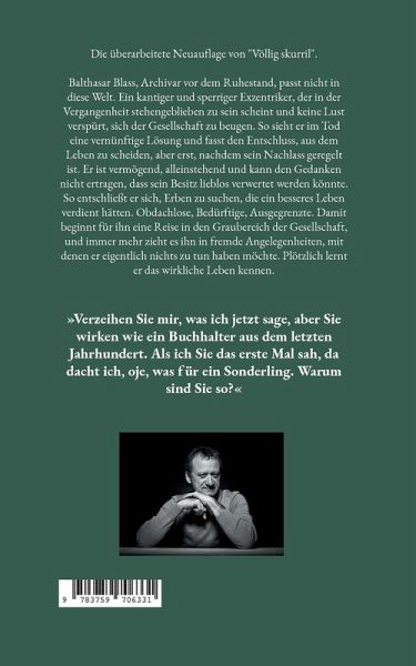 Die überarbeitete Neuauflage von "Völlig skurril"Balthasar Blass, Archivar vor dem Ruhestand, passt nicht in diese Welt. Ein kantiger und sperriger Sonderling, der in der Vergangenheit stehengeblieben zu sein scheint und keine Lust verspürt, sich der Gesellschaft zu beugen. So sieht er im Tod eine vernünftige Lösung und fasst den Entschluss, aus dem Leben zu scheiden, aber erst, nachdem sein Nachlass geregelt ist. Er ist vermögend, alleinstehend und kann den Gedanken nicht ertragen, dass sein Besitz lieblos verwertet werden könnte. So entschließt er sich, Erben zu suchen, die ein besseres Leben verdient hätten. Obdachlose, Bedürftige, Ausgegrenzte.Damit beginnt für ihn eine Reise in den Graubereich der Gesellschaft, und immer mehr zieht es ihn in fremde Angelegenheiten, mit denen er eigentlich nichts zu tun haben möchte. Plötzlich lernt er das wirkliche Leben kennen.