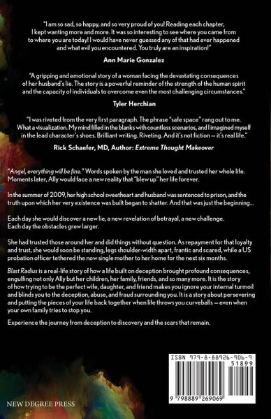 "Angel, everything will be fine." Words spoken by the man she loved and trusted her whole life. Moments later, Ally would face a new reality that "blew up" her life forever. In the summer of 2009, her high school sweetheart and husband was sentenced to prison and the truth upon which her very existence was built began to shatter. And that was just the beginning... Each day she would discover a new lie, a new revelation of betrayal; a new challenge. Each day the obstacles grew larger. She had trusted those around her and did things without question. As repayment for that loyalty and trust, she would soon be standing, legs shoulder-width apart, frantic and scared, while a U.S. Probation Officer tethered the now single mother to her home for the next 6 months. Blast Radius is a real-life story of how a life built on deception brought profound consequences engulfing not only Ally, but her children, her family, friends, and so many more. It is the story of how trying to be the perfect wife, daughter, and friend makes you ignore your internal turmoil and blinds you to the deception, abuse, and fraud surrounding you. It is a story about persevering and putting the pieces of your life back together when life throws you curveballs - even your own family is trying to stop you. Experience the journey from deception to discovery and the scars that remain.