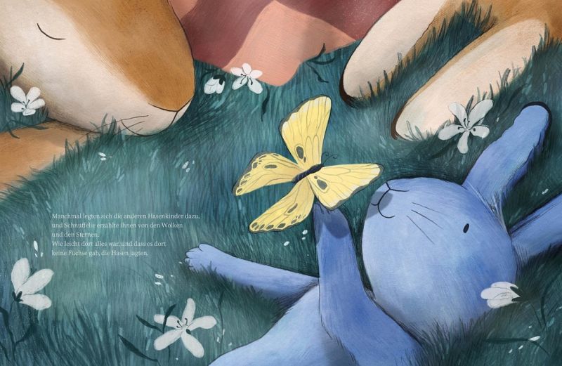 In einer warmen Sommernacht kam ein Hasenbaby auf die Welt. Es war sehr klein, ganz zart, und sein Fell schimmerte in einem sanften Blau. Die Haseneltern nannten es Schnuffelie, wie ein leises Hasen-Schnuffeln. Schnuffelie schlief viel. Und wenn es schlief, träumte es wunderschöne Träume vom Himmel und den Wolken. Eines Tages wuchsen Schnuffelie dann Flügel. "Mama", rief es, "Papa, seht doch - nun kann ich fliegen!" Und Schnuffelie flog zu den Sternen.
