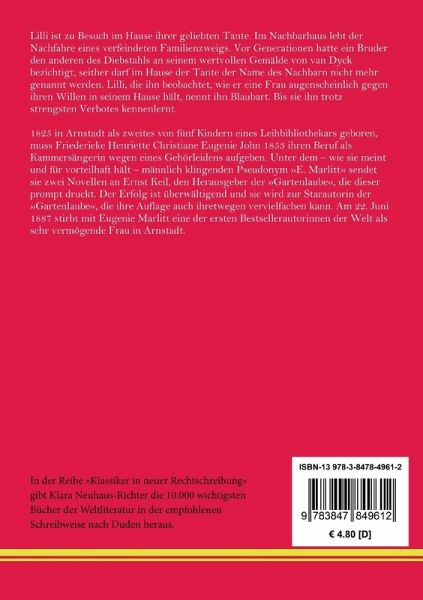 In der Reihe »Klassiker in neuer Rechtschreibung« gibt Klara Neuhaus-Richter die wichtigsten Bücher der Weltliteratur in der empfohlenen Schreibweise nach Duden heraus. Eugenie Marlitt: Blaubart. Der verschwundene van Dyck Lilli ist zu Besuch im Hause ihrer geliebten Tante. Im Nachbarhaus lebt der Nachfahre eines verfeindeten Familienzweigs. Vor Generationen hatte ein Bruder den anderen des Diebstahls an seinem wertvollen Gemälde von van Dyck bezichtigt, seither darf im Hause der Tante der Name des Nachbarn nicht mehr genannt werden. Lilli, die ihn beobachtet, wie er eine Frau augenscheinlich gegen ihren Willen in seinem Hause hält, nennt ihn Blaubart. Bis sie ihn trotz strengsten Verbotes kennenlernt. Erstdruck in: Gartenlaube, Leipzig (Ernst Keil) Juni 1866, erste Buchausgabe in: Thüringer Erzählungen, Leipzig (Ernst Keil) 1869. Textgrundlage ist die Ausgabe: Eugenie Marlitt: Gesammelte Romane und Novellen. 2. Auflage, Band 1¿10, Leipzig: Verlag von Ernst Keil¿s Nachfolger G.m.b.H., 1900. Die Paginierung obiger Ausgabe wird in dieser Neuausgabe als Marginalie zeilengenau mitgeführt. Neu herausgegeben und mit einer Biografie der Autorin versehen von Klara Neuhaus-Richter, Berlin 2021. Umschlaggestaltung von Rainer Richter unter Verwendung einer Porträtzeichnung von Josefine Weinschrott. Gesetzt aus der Minion Pro, 11 pt. Henricus - Edition Deutsche Klassik GmbH Über die Autorin: 1825 in Arnstadt als zweites von fünf Kindern eines Leihbibliothekars geboren, muss Friederieke Henriette Christiane Eugenie John 1853 ihren Beruf als Kammersängerin wegen eines Gehörleidens aufgeben. Unter dem ¿ wie sie meint und für vorteilhaft hält ¿ männlich klingenden Pseudonym »E. Marlitt« sendet sie zwei Novellen an Ernst Keil, den Herausgeber der »Gartenlaube«, die dieser prompt druckt. Der Erfolg ist überwältigend und sie wird zur Starautorin der »Gartenlaube«, die ihre Auflage auch ihretwegen vervielfachen kann. Am 22. Juni 1887 stirbt mit Eugenie Marlitt eine der ersten Bestsellerautorinnen der Welt als sehr vermögende Frau in Arnstadt.
