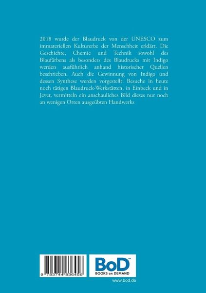 2018 wurde der Blaudruck von der UNESCO zum immateriellen Kulturerbe der Menschheit erklärt. Die Geschichte, Chemie und Technik sowohl des Blaufärbens als besonders des Blaudrucks mit Indigo werden ausführlich anhand historischer Quellen beschrieben. Auch die Gewinnung von Indigo und dessen Synthese werden vorgestellt. Besuche in heute noch tätigen Blaudruck-Werkstätten, in Einbeck und in Jever, vermitteln ein anschauliches Bild dieses nur noch an wenigen Orten ausgeübten Handwerks