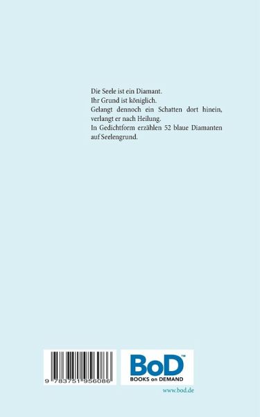 Die Seele ist ein Diamant. Ihr Grund ist königlich.Gelangt dennoch ein Schatten dort hinein, verlangt er nach Heilung.In Gedichtform erzählen 52 blaue Diamanten auf Seelengrund.