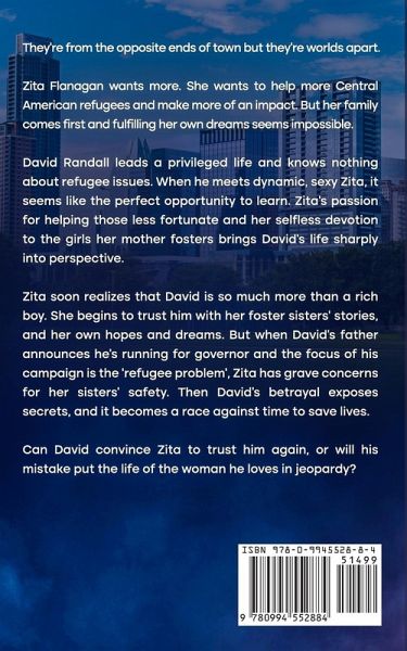 They're from the opposite ends of town but they're worlds apart. Zita Flanagan wants more. She wants to help more Central American refugees and make more of an impact. But her family comes first and fulfilling her own dreams seems impossible. David Randall leads a privileged life and knows nothing about refugee issues. When he meets dynamic, sexy Zita, it seems like the perfect opportunity to learn. Zita's passion for helping those less fortunate and her selfless devotion to the girls her mother fosters brings David's life sharply into perspective. Zita soon realizes that David is so much more than a rich boy. She begins to trust him with her foster sisters' stories, and her own hopes and dreams. But when David's father announces he's running for governor and the focus of his campaign is the 'refugee problem', Zita has grave concerns for her sisters' safety. Then David's betrayal exposes secrets, and it becomes a race against time to save lives. Can David convince Zita to trust him again, or will his mistake put the life of the woman he loves in jeopardy?