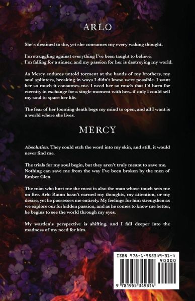 Mercy endures brutal punishment for her so-called sins, and Arlo's warped worldview begins to fracture. While his affection for her grows, she comes to accept her fate. Knowing her death is inevitable, their passion ignites, setting a blaze across the boundary line between purity and pleasure. ARLO She's destined to die, yet she consumes my every waking thought. I'm struggling against everything I've been taught to believe. I'm falling for a sinner, and my passion for her is destroying my world. As Mercy endures untold torment at the hands of my brothers, my soul splinters, breaking in ways I didn't know were possible. I want her so much it consumes me. I need her so much that I'd burn for eternity in exchange for a single moment with her...if only I could sell my soul to spare her life. The fear of her looming death begs my mind to open, and all I want is a world where she lives. MERCY Absolution. They could etch the word into my skin, and still, it would never find me. The trials for my soul begin, but they aren't truly meant to save me. Nothing can save me from the way I've been broken by the men of Ember Glen. The man who hurt me the most is also the man whose touch sets me on fire. Arlo Rainn hasn't earned my thoughts, my attention, or my desire, yet he possesses me entirely. My feelings for him strengthen as we explore our forbidden passion, and as he comes to know me better, he begins to see the world through my eyes. My warden's perspective is shifting, and I fall deeper into the madness of my need for him. READING ORDER Book 1: Spark of Madness Book 2: Blaze of Misery Book 3: Embers of Mercy This is a dark romance series that involves many triggering elements which may be upsetting for some readers. A complete list of tropes and triggers can be found on the author's website.