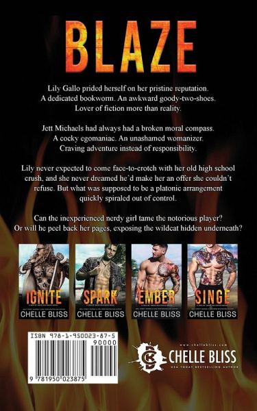 Lily Gallo prided herself on her pristine reputation. A dedicated bookworm. An awkward goody-two-shoes. Lover of fiction more than reality. Jett Michaels had always had a broken moral compass. A cocky egomaniac. An unashamed womanizer. Craving adventure instead of responsibility. Lily never expected to come face-to-crotch with her old high school crush, and she never dreamed he'd make her an offer she couldn't refuse. But what was supposed to be a platonic arrangement quickly spiraled out of control. Can the inexperienced nerdy girl tame the notorious player? Or will he peel back her pages, exposing the wildcat hidden underneath? Blaze is the fourth full-length standalone novel in the Men of Inked Heatwave series by USA Today bestselling author Chelle Bliss. Men of Inked: Heatwave Series:Book 1 - Flame Book 2 - Burn Book 3 - Wildfire Book 4 - Blaze Book 5 - Ignite
