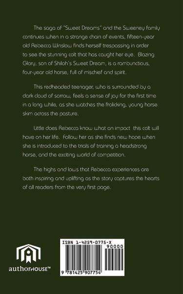 The saga of "Sweet Dreams" and the Sweeney family continues when in a strange chain of events, fifteen-year old Rebecca Winslow finds herself trespassing in order to see the stunning colt that has caught her eye. Blazing Glory, son of Shiloh''s Sweet Dream, is a rambunctious, four-year old horse, full of mischief and spirit. This redheaded teenager, who is surrounded by a dark cloud of sorrow, feels a sense of joy for the first time in a long while, as she watches the frolicking, young horse skim across the pasture. Little does Rebecca know what an impact this colt will have on her life. Follow her as she finds new hope when she is introduced to the trails of training a headstrong horse, and the exciting world of competition. The highs and lows that Rebecca experiences are both inspiring and uplifting as the story captures the hearts of all readers from the very first page.
