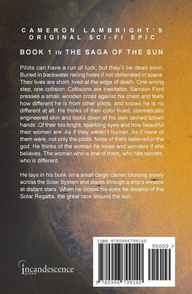 Simmering space opera, a dash of hard science fiction, two servings of frenetic action, bubbly neon light adventure, sex, violence, love and -- God? Or just, 'the god'? It's all here in Cameron Lambright's original indy sci-fi racing epic. FROM THE BACK COVER: Pilots can have a run of luck, but they'll be dead soon. Buried in backwater racing holes if not obliterated in space. Their lives are short, lived at the edge of death. One wrong step, one collision. Collisions are inevitable. Samson Ford presses a small, wooden cross against his chest and feels how different he is from other pilots, and knows he is no different at all. He thinks of their color hued, cosmetically engineered skin and looks down at his own tanned brown hands. Of their too bright, sparkling eyes and how beautiful their women are. As if they weren't human. As if none of them were, not only the pilots. None of them believed in the god. He thinks of the woman he loves and wonders if she believes. The woman who is one of them, who has secrets, who is different. He lays in his bunk on a small cargo carrier cruising slowly across the Solar System and stares through a ship's window at distant stars. When he closes his eyes he dreams of the Solar Regatta, the great race around the sun.