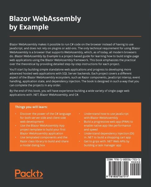 Discover blueprints that explore various components of Blazor, C#, and .NET to help you build web apps without learning JavaScript Key Features:Explore complete, easy-to-follow web projects using Blazor Build projects such as a weather app, expense tracker, and Kanban board with real-world applications Understand and work with Blazor WebAssembly effectively without spending too much time focusing on the theory Book Description: Blazor WebAssembly makes it possible to run C# code on the browser instead of having to use JavaScript, and does not rely on plugins or add-ons. The only technical requirement for using Blazor WebAssembly is a browser that supports WebAssembly, which, as of today, all modern browsers do. Blazor WebAssembly by Example is a project-based guide for learning how to build single-page web applications using the Blazor WebAssembly framework. This book emphasizes the practical over the theoretical by providing detailed step-by-step instructions for each project. You'll start by building simple standalone web applications and progress to developing more advanced hosted web applications with SQL Server backends. Each project covers a different aspect of the Blazor WebAssembly ecosystem, such as Razor components, JavaScript interop, event handling, application state, and dependency injection. The book is designed in such a way that you can complete the projects in any order. By the end of this book, you will have experience building a wide variety of single-page web applications with .NET, Blazor WebAssembly, and C#. What You Will Learn:Discover the power of the C# language for both server-side and client-side web development Use the Blazor WebAssembly App project template to build your first Blazor WebAssembly application Use templated components and the Razor class library to build and share a modal dialog box Understand how to use JavaScript with Blazor WebAssembly Build a progressive web app (PWA) to enable native app-like performance and speed Understand dependency injection (DI) in .NET to build a shopping cart app Get to grips with .NET Web APIs by building a task manager app Who this book is for: This book is for .NET web developers who are tired of constantly learning new JavaScript frameworks and wish to write web applications using Blazor WebAssembly, leveraging the power of .NET and C#. The book assumes beginner-level knowledge of the C# language, .NET framework, Microsoft Visual Studio, and web development concepts.