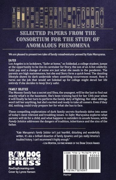 The Selected Papers From the Consortium for the Study of Anomalous Phenomena presents two tales of family misadventures penned by Kate Maruyama. SAFER Los Angeles is in lockdown, "Safer at home," so Soledad, a college student, jumps at the opportunity to be live-in caretaker for Story, the son of an A-list celebrity. Solid pay and a change of scene are just what she needs in the pandemic. The parents are high maintenance, but she and Story form a quick bond. The dazzling lifestyle shows its dark underside when unsettling occurrences mount. Now it turns out the job that would set Soledad up for college might derail her life entirely if she decides to keep Story safer. FAMILY SOLSTICE The Massey family has a secret and Shea, the youngest, will be the last to find out exactly what's in the basement. She's been training hard for her 13th year when it will finally be her turn to perform the family duty of fighting. Her older siblings won't tell her anything, but she's excited and ready to take all comers. Even if they had, nothing could truly prepare her for what she has to face. These compelling explorations of dark family secrets fearlessly delve into some of today's most relevant and troubling issues. In Safer, Maruyama explores what parents will do for a child, and what happens to outsiders in unsafe houses, while Family Solstice addresses the dangers of tradition, inheritance and the sins of the father.