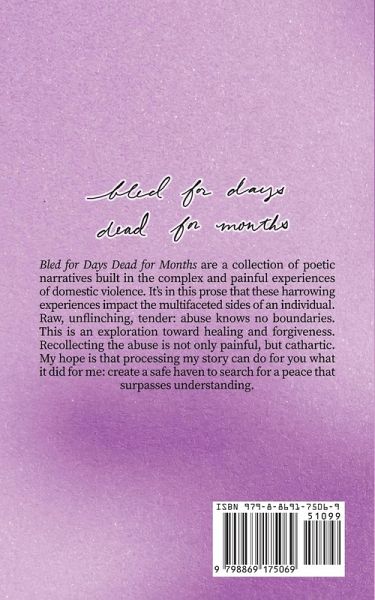 Bled for Days Dead for Months are a collection of poetic narratives built in the complex and painful experiences of domestic violence. It's in this prose that these harrowing experiences impact the multifaceted sides of an individual. Raw, unflinching, tender: abuse knows no boundaries. This is an exploration toward healing and forgiveness. Recollecting the abuse is not only painful, but cathartic. My hope is that processing my story can do for you what it did for me: create a safe haven to search for a peace that surpasses understanding.