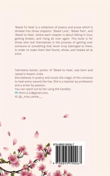 'Bleed To Heal' is a collection of poetry and prose which is divided into three chapters: 'Bleed Love', 'Bleed Pain', and 'Bleed to Heal', where each chapter is about falling in love, getting broken, and rising all over again. This book is for those who lost themselves in the process of getting over someone or something that never truly belonged to them, in order to make them feel found, whole, and healed all at once.