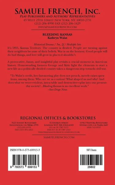 Historical DramaCharacters: 3 male, 2 femaleIt's 1855, Kansas Territory. The country is divided. People are turning against their neighbors because of their beliefs. War is on the horizon. Good people will do bad things and love will grow in places it shouldn't. A provocative, funny and insightful play revisits a crucial moment in American history. Homesteading farmers George and Kitty fight the elements to start a new life as a politically divided country takes a dangerous step to