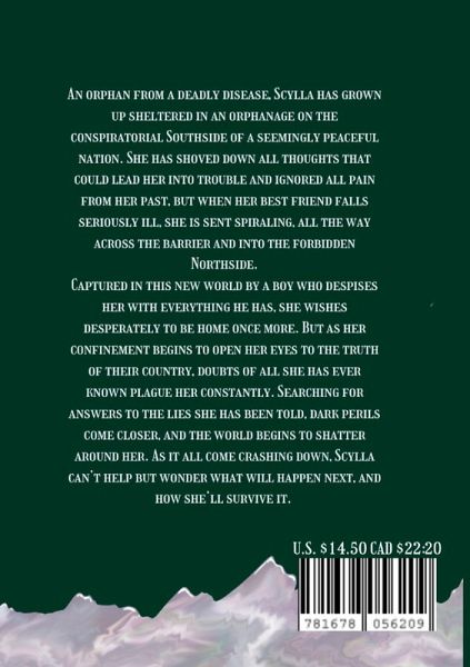 Orphaned by one of the deadliest diseases ever known, Scylla has grown up sheltered in an orphanage. She has also grown up listening to the people of the town near the orphanage spout conspiracies about the government and those who control it, on the other side of the river barrier. Stuck on the Southside of a seemingly peaceful nation, Scylla has shoved down all curiosities about what lays on the Northside. However, when her best friend falls seriously ill, Scylla is sent spiraling. All the way across the barrier. Captured in this new world by a boy who despises her with everything he has, Scylla desperately waits to get back home. The longer Scylla spends in her Northside confinement, the more she begins to realize how imperfect this country actually is. Plagued by doubts of everything she has ever known, the world around her begins to slowly crumble with each new thing she learns. Searching for the answers to the lies of the world she lives in, those who hunt her stalk closer with each passing day. As it all comes crashing down, Scylla can't help but wonder what will happen next, or how she'll survive it.