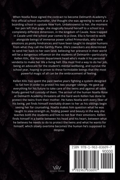 When Noella Rose signed the contract to become Delmarth Academy's first official school counselor, she thought she was agreeing to work at a boarding school in upstate New York. Unbeknownst to her, the moment her pen left that page, she magically bound herself to a school in a completely different dimension, in the kingdom of Cavale. Now trapped in Cavale until the school year comes to a close, Ella is forced to work alongside beings of immense power called Primordials, who view emotions as pesky hindrances and have been taught to despise humans from what they call the Earthly Plane. Ella's coworkers are determined to send her back to her own land, believing her presence in their world will be a dangerous influence on the students of Delmarth-particularly Kellen Kilic, the Varmin department head who's made it his personal vendetta to make her life a living hell. Ella must find a way to do her job, being an advocate for the student's mental wellbeing, and survive the school year, hoping to prove to these formidable beings that the most powerful magic of all can be the embracement of feeling. Kellen Kilic has spent the past twelve years fighting a system designed to fail him in order to protect his two younger siblings. He gave up everything for his future to take care of the twins and against all odds finally gained full custody of them. The arrival of the human Noella Rose at Delmarth Academy threatens all the hard work Kellen has done to protect the twins from their mother. He hates Noella with every fiber of his being, yet finds himself inevitably drawn to her as his siblings begin seeing her for counseling. Noella makes him question what he was taught to view strength as, finding power and beauty in the way she teaches both the students and him to not fear their emotions. Kellen finds himself in a battle between his head and his heart, between what he believes he needs to do to protect the twins and what he wants for himself, which slowly overtime becomes the human he's supposed to despise.
