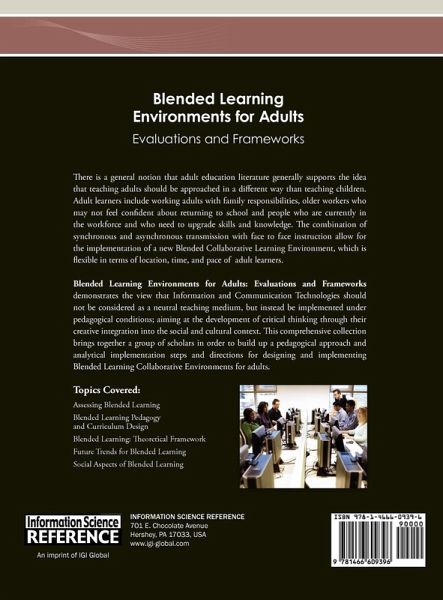 There is a general notion that adult education literature generally supports the idea that teaching adults should be approached in a different way than teaching children. Adult learners include working adults with family responsibilities, older workers who may not feel confident about returning to school and people who are currently in the workforce and who need to upgrade skills and knowledge. The combination of synchronous and asynchronous transmission with face to face instruction allow for the implementation of a new Blended Collaborative Learning Environment, which is flexible in terms of location, time, and pace of adult learners. Blended Learning Environments for Adults: Evaluations and Frameworks demonstrates the view that Information and Communication Technologies should not be considered as a neutral teaching medium, but instead be implemented under pedagogical conditions; aiming at the development of critical thinking through their creative integration into the social and cultural context. This comprehensive collection brings a group of scholars in order to build up a pedagogical approach and analytical implementation steps and directions for designing and implementing Blended Learning Collaborative Environments for adults.
