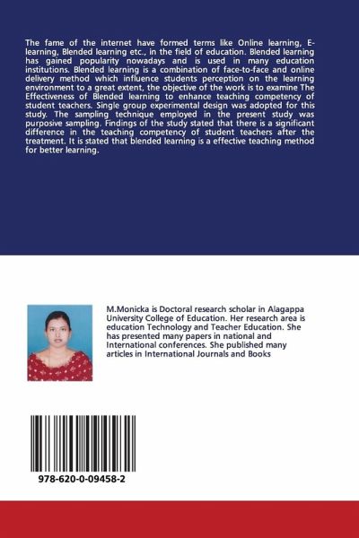 The fame of the internet have formed terms like Online learning, E-learning, Blended learning etc., in the field of education. Blended learning has gained popularity nowadays and is used in many education institutions. Blended learning is a combination of face-to-face and online delivery method which influence students perception on the learning environment to a great extent, the objective of the work is to examine The Effectiveness of Blended learning to enhance teaching competency of student teachers. Single group experimental design was adopted for this study. The sampling technique employed in the present study was purposive sampling. Findings of the study stated that there is a significant difference in the teaching competency of student teachers after the treatment. It is stated that blended learning is a effective teaching method for better learning.