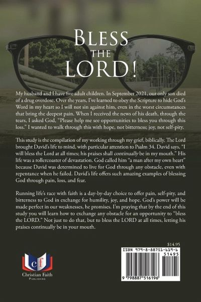 My husband and I have five adult children. In September 2021, our only son died of a drug overdose. Over the years, I've learned to obey the Scripture to hide God's Word in my heart so I will not sin against him, even in the worst circumstances that bring the deepest pain. When I received the news of his death, through the tears, I asked God, "Please help me see opportunities to bless you through this loss." I wanted to walk through this with hope, not bitterness; joy, not self-pity. This study is the compilation of my working through my grief, biblically. The Lord brought David's life to mind, with particular attention to Psalm 34. David says, "I will bless the Lord at all times; his praises shall continually be in my mouth." His life was a rollercoaster of devastation. God called him "a man after my own heart" because David was determined to live for God through any obstacle, even with repentance when he failed. David's life offers such amazing examples of blessing God through pain, loss, and fear. Running life's race with faith is a day-by-day choice to offer pain, self-pity, and bitterness to God in exchange for humility, joy, and hope. God's power will be made perfect in our weaknesses, he promises. I'm praying that by the end of this study you will learn how to exchange any obstacle for an opportunity to "bless the Lord." Not just to do that, but to bless the Lord at all times, letting his praises continually be in your mouth.