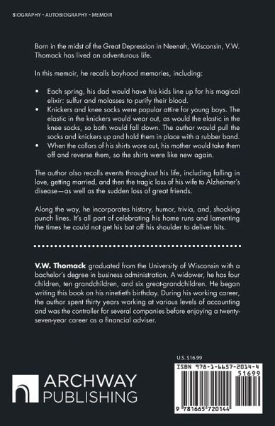 Born in the midst of the Great Depression in Neenah, Wisconsin, V.W. Thomack has lived an adventurous life. In this memoir, he recalls boyhood memories, including: ¿ Each spring, his dad would have his kids line up for his magical elixir: sulfur and molasses to purify their blood. ¿ Knickers and knee socks were popular attire for young boys. The elastic in the knickers would wear out, as would the elastic in the knee socks, so both would fall down. The author would pull the socks and knickers up and hold them in place with a rubber band. ¿ When the collars of his shirts wore out, his mother would take them off and reverse them, so the shirts were like new again. The author also recalls events throughout his life, including falling in love, getting married, and then the tragic loss of his wife to Alzheimer's disease-as well as the sudden loss of great friends. Along the way, he incorporates history, humor, trivia, and, shocking punch lines. It's all part of celebrating his home runs and lamenting the times he could not get his bat off his shoulder to deliver hits.