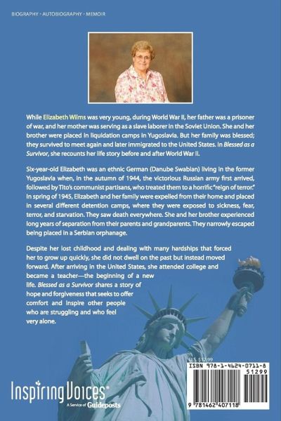 While Elizabeth Wilms was very young, during World War II, her father was a prisoner of war, and her mother was serving as a slave laborer in the Soviet Union. She and her brother were placed in liquidation camps in Yugoslavia. But her family was blessed; they survived to meet again and later immigrated to the United States. In Blessed as a Survivor, she recounts her life story before and after World War II. Six-year-old Elizabeth was an ethnic German (Danube Swabian) living in the former Yugoslavia when, in the autumn of 1944, the victorious Russian army first arrived, followed by Tito's communist partisans, who treated them to a horrific "reign of terror." In spring of 1945, Elizabeth and her family were expelled from their home and placed in several different detention camps, where they were exposed to sickness, fear, terror, and starvation. They saw death everywhere. She and her brother experienced long years of separation from their parents and grandparents. They narrowly escaped being placed in a Serbian orphanage. Despite her lost childhood and dealing with many hardships that forced her to grow up quickly, she did not dwell on the past but instead moved forward. After arriving in the United States, she attended college and became a teacher-the beginning of a new life. Blessed as a Survivor shares a story of hope and forgiveness that seeks to offer comfort and inspire other people who are struggling and who feel very alone.