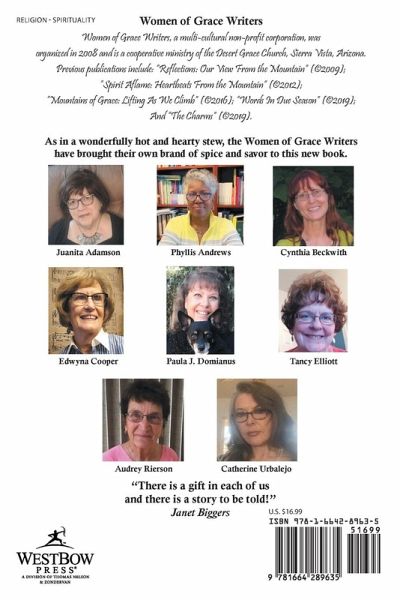 Women of Grace Writers Women of Grace Writers, a multi-cultural non-profit corporation, was organized in 2008 and is a cooperative ministry of the Desert Grace Church, Sierra Vista, Arizona. Previous publications include: "Reflections: Our View From the Mountain" (©2009); "Spirit Aflame: Heartbeats From the Mountain" (©2012); "Mountains of Grace: Lifting As We Climb" (©2016); "Words In Due Season" (©2019); And "The Charms" (©2019). As in a wonderfully hot and hearty stew, the Women of Grace Writers have brought their own brand of spice and savor to this new book.