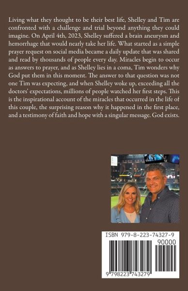 Living what they thought to be their best life, Shelley and Tim are confronted with a challenge and trial beyond anything they could imagine. On April 4th, 2023, Shelley suffered a brain aneurysm and hemorrhage that would nearly take her life. What started as a simple prayer request on social media became a daily update that was shared and read by thousands of people every day. Miracle after miracle begins to occur as answers to prayer, and as Shelley lies in a coma, Tim wonders why God put them in this moment. The answer to that question was not one Tim was expecting, and when Shelley woke up, exceeding all the doctors' expectations, millions of people watched her first steps. This is the inspirational account of the miracles that occurred in the life of this couple, the suprising reason why it happened in the first place, and a testimony of faith and hope with a singular message. God exists.
