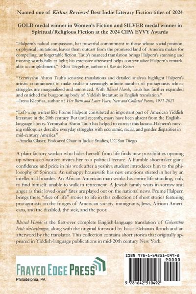 A plain factory worker who hides herself from life finds new possibilities opening up when a co-worker invites her to a political lecture. A humble shoemaker gains confidence and pride in his work after a yeshiva student introduces him to the philosophy of Spinoza. An unhappy housewife has new emotions stirred in her by an intellectual boarder. An African American man works his entire life standing, only to find himself unable to walk in retirement. A Jewish family waits in sorrow and anger as their loved ones' fates are played out on the national news. Frume Halpern brings these "slice of life" stories to life in this collection of short stories featuring protagonists on the fringes of American society: immigrants, Jews, African Americans, and the disabled, the sick, and the poor. ¿Blessed Hands is the frst ever complete English-language translation of Gebenshte hent: dertseylungen, along with the original foreword by Isaac Elchanan Ronch and an afterword by the translator. This collection contains short stories were that were published over several decades in the left-wing daily newspaper Morgn frayhayt [Morning Freedom] and other Yiddish-language outlets in mid-20th century New York. ¿These psychologically insightful stories present the lives of protagonists who are working-class poor, social outcasts, and those experiencing illness, disability, and racism. Halpern worked as a massage therapist in a hospital and many of these stories are about those who work with their hands: workshop/factory workers, piece workers, a shoemaker, a butcher, and a hairdresser.