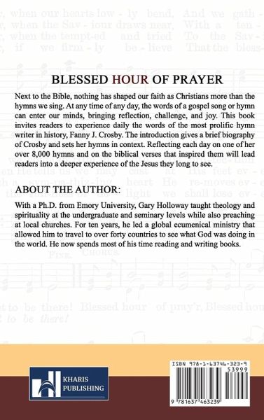 Next to the Bible, nothing has shaped our faith as Christians more than the hymns we sing. At any time of any day, the words of a gospel song or hymn can enter our minds, bringing reflection, challenge, and joy. This book invites readers to experience daily the words of the most prolific hymn writer in history, Fanny J. Crosby. The introduction gives a brief biography of Crosby and sets her hymns in context. Reflecting each day on one of her over 8,000 hymns and on the biblical verses that inspired them will lead readers into a deeper experience of the Jesus they long to see. Endorsement:Only a hymn writer as prolific as Fanny Crosby could have enough material to inspire 365 daily meditations. And only a true hymn lover could curate her offerings so skillfully into this wonderful devotional guide. Gary Holloway has crafted thoughtful reflections on Crosby's best known hymns while also spotlighting wonderful, lesser known gems. In the process he reminds us once again how deep, beautiful and poignant the blind poet's work actually is. This collection is a loving, beautifully crafted treasure. -Randy Gill, D.M.A., Professor and Director of Worship Arts, Lipscomb University, Nashville, TN About the Author: With a Ph.D. from Emory University, Gary Holloway taught theology and spirituality at the undergraduate and seminary levels while also preaching at local churches. For ten years, he led a global ecumenical ministry that allowed him to travel to over forty countries to see what God was doing in the world. He now spends most of his time reading and writing books.