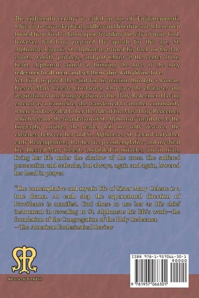 The eighteenth century is called an age of "Enlightenment", which is to say a skeptical, godless and libertine age where men turned from God to labor upon founding the city of man. God, however, had long prepared His apostle for this age, St. Alphonsus Liguori. St. Alphonsus turned his back on the law courts, worldly privilege, and put Christ at the center of his heart. Alphonsus aimed at bringing the love of the holy redeemer to all men, and set them afire with divine love. Yet, God prepared the saint for his mission through a woman, Blessed Mary Celeste Crostarosa, who gave the character and inspiration to the Congregation of the Holy Redeemer. Having entered as a Carmelite, she transferred to another community where God revealed to her the rule of the Most Holy Redeemer, which became the foundation of St. Alphonsus' institute. As the biography unfolds, the reader will not only discover the closeness between her and St. Alphonsus, St. Gerard and other early Redemptorists, but her deep contemplative and mystical life. Blessed Mary Celeste abounded in miracles, and in trials, living her life under the shadow of the cross. She suffered persecution and setbacks, but always, again and again, lowered her head in prayer. "The contemplative and mystic life of Sister Mary Celeste is a true drama. At each step the supernatural direction of Providence is manifest. God chose to use her as His chief instrument in revealing to St. Alphonsus his life's work-the foundation of the Congregation of the Holy Redeemer. -The American Ecclesiastical Review