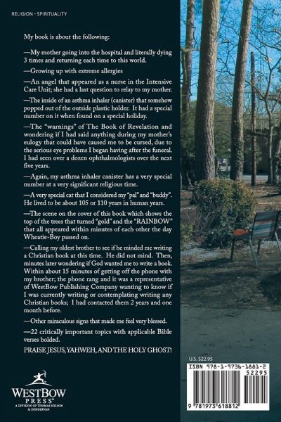 My book is about the following: -My mother going into the hospital and literally dying 3 times and returning each time to this world. -Growing up with extreme allergies -An angel that appeared as a nurse in the Intensive Care Unit; she had a last question to relay to my mother. -The inside of an asthma inhaler (canister) that somehow popped out of the outside plastic holder. It had a special number on it when found on a special holiday. -The "warnings" of The Book of Revelation and wondering if I had said anything during my mother's eulogy that could have caused me to be cursed, due to the serious eye problems I began having after the funeral. I had seen over a dozen ophthalmologists over the next five years. -Again, my asthma inhaler canister has a very special number at a very significant religious time. -A very special cat that I considered my "pal" and "buddy". He lived to be about 105 or 110 years in human years. -The scene on the cover of this book which shows the top of the trees that turned "gold" and the "RAINBOW" that all appeared within minutes of each other the day Wheatie-Boy passed on. -Calling my oldest brother to see if he minded me writing a Christian book at this time. He did not mind. Then, minutes later wondering if God wanted me to write a book. Within about 15 minutes of getting off the phone with my brother; the phone rang and it was a representative of WestBow Publishing Company wanting to know if I was currently writing or contemplating writing any Christian books; I had contacted them 2 years and one month before. -Other miraculous signs that made me feel very blessed. -22 critically important topics with applicable Bible verses bolded. PRAISE JESUS, YAHWEH, AND THE HOLY GHOST!