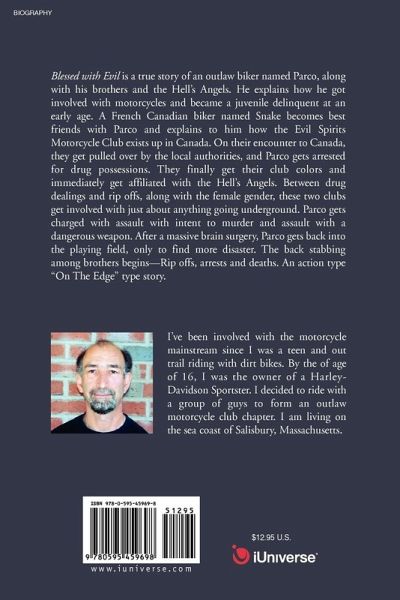 Blessed with Evil is a true story of an outlaw biker named Parco, along with his brothers and the Hell's Angels. He explains how he got involved with motorcycles and became a juvenile delinquent at an early age. A French Canadian biker named Snake becomes best friends with Parco and explains to him how the Evil Spirits Motorcycle Club exists up in Canada. On their encounter to Canada, they get pulled over by the local authorities, and Parco gets arrested for drug possessions. They finally get their club colors and immediately get affiliated with the Hell's Angels. Between drug dealings and rip offs, along with the female gender, these two clubs get involved with just about anything going underground. Parco gets charged with assault with intent to murder and assault with a dangerous weapon. After a massive brain surgery, Parco gets back into the playing field, only to find more disaster. The back stabbing among brothers begins-Rip offs, arrests and deaths. An action type "On The Edge" type story.