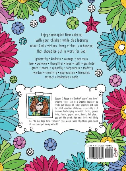 Enjoy some quiet time coloring with your children while also learning about God's virtues! Every virtue is a blessing that should be put to work for God! generosity - kindness - courage - meekness love - patience - thoughtful - hope - faith - gratitude grace - peace - sympathy - forgiveness - modesty wisdom - creativity - appreciation - friendship respect - leadership - noble Suzann E. Poppe is a Dunkin sippin', dog lovin' creative type. She is a graphic designer by trade but enjoys all things creative and lives for each creative challenge especially if it involves landscaping materials, 2x4's, power tools, fabric, paper, yarn, beads, hot glue... you get the point. Her next book will likely be "Do my dogs have virtues?" She would wear flip-flops year-round if she could get away with it!