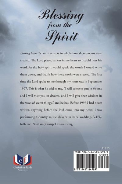 Blessing from the Spirit reflects in whole how these poems were created. The Lord placed an ear in my heart so I could hear his word. As the holy spirit would speak the words I would write them down, and that is how these works were created. The first time the Lord spoke to me through my heart was in September 1997. This is what he said to me, "I will come to you in visions and I will visit you in dreams, and I will give thee wisdom in the ways of secret things," and he has. Before 1997 I had never written anything before the lord came into my heart, I was performing Country music classics in bars, wedding, V.F.W. halls etc. Now, only Gospel music I sing.