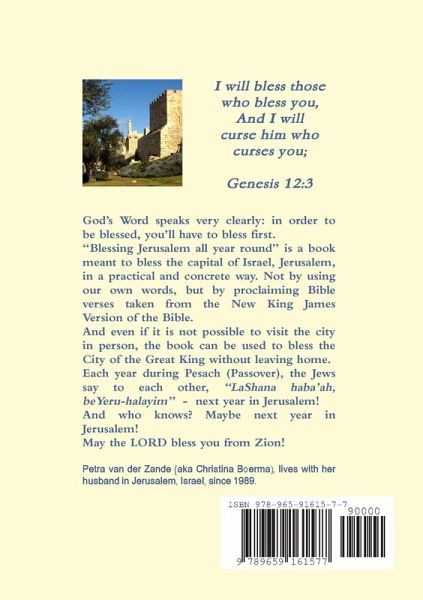 "Blessing Jerusalem all year round" is a book meant to bless the capital of Israel - Jerusalem, in a practical and concrete way. Not by using our own words, but by proclaiming Bible verses taken from the New King James Version of the Bible. And even if you're not able to come and visit Jerusalem, you can bless the City of the Great King without leaving home.