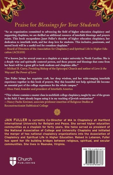 An essential interfaith resource for university chaplains and spiritual leaders in higher education. In an increasingly heterogenous age, any university chaplains and spiritual leaders struggle to center their student communities, aware of vast diversities in their needs - the prayers of one tradition are rarely sufficient to honor the many paths their students may be travelling. With this heartfelt collection of interfaith prayers, Janet Fuller leverages the fruits of 40 years of chaplaincy to bridge this gap, offering sample prayers and spiritual direction for use across all communities of learning, from the first day of school to the bittersweet crossroads of graduation. Chaplains will find support for all the essential student struggles, including new beginnings, athletics, loneliness, and the search for hope. For use in part or whole, or as templates for other prayers, these blessings provide a voice for academic communities as they gather to give thanks, remember, and look to the future, all using language that commends itself to many spiritual paths or none at all. The prayers can also be adapted for chaplain use in hospitals, prisons, continuous care retirement communities, military gatherings, and many others. In a time when many exhibit a disinclination to hear with ears or hearts, Blessings for Your Students invites readers to listen closely to the power of prayer.