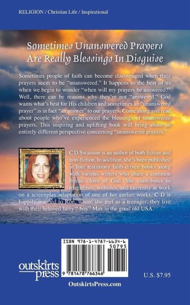 BLESSINGS IN DISGUISE -- Sometimes prayers that go unanswered can be "blessings in disguise." It can happen to any of us if our prayers go "unanswered" for any length of time. But, did you ever think that this can be an "answer" to our "prayers?" God is on His time table and His ways are perfect...so, maybe just maybe the "unanswered prayers" can be "an answered prayer" all along. This book takes the reader on a journey inside the lives of regular everyday people who have shared their testimonies and circumstances revealing how an "unanswered prayer" was in fact truly a blessing in disguise. Read about their uplifting trials as they waited for answers. You will be inspired and honored to be reading of their heartfelt stories given to the Author, who brings them to life with her powerful writing style. You will laugh, cry, and rejoice! This book will be a delight to any person of faith and a must have to add to their collection of faith filled stories. C D SWANSON is a prolific writer who has written over seventeen books to date and continues to dazzle with her apparent love of the Lord through her humble and down to earth writing style. She writes for His glory and delivers another winner in our eyes. Her books have received "quiet critical acclaim" and she's the best kept secret that no one knows about. But, for her she states emphatically, "I give all the glory and honor to the Lord my God. It is for Him I write. So, as long as He knows, that is the most important thing for me."