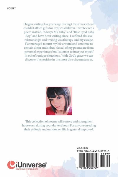 I began writing five years ago during Christmas when I couldn't afford gifts for my two children. I wrote each a poem instead, "Always My Baby" and "Blue Eyed Baby Boy" and have been writing since. I suffered abusive relationships and writing was therapy and my escape. I've managed to turn my life around and continue to remain clean and sober. Not all of my poems are from personal experiences but I attempt to interject myself in other's unique situations. With God's grace we can discover the positive in the most dire circumstances.