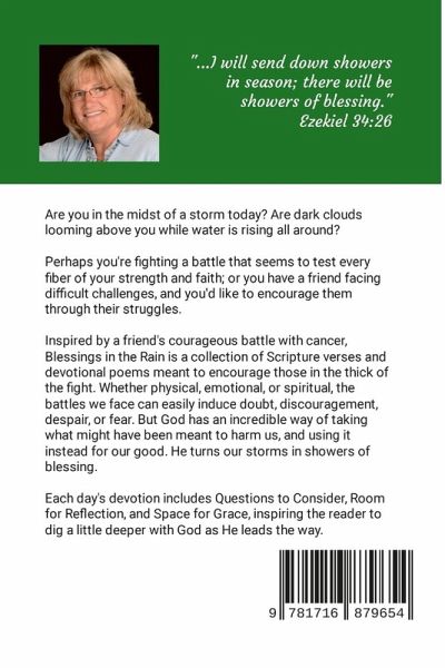 "I will send down showers in season; there will be showers of blessing." Ezekiel 34:26b NIV Are you in the midst of a storm, today? Are dark clouds looming above you while water is rising around you? Or do you find yourself fighting a battle that seems to test every fiber of your strength and faith? Or maybe you have a friend facing a difficult challenge, and you'd like to encourage them through their battle. Inspired by a friend's courageous battle with cancer, Blessings in the Rain is a collection of Scripture verses and poems meant to encourage those who find themselves fighting battles of their own. Whether physical, mental or spiritual...the battles we face daily can easily cause us doubt, discouragement, despair, or fear. But God has an incredible way of taking what might have been meant to harm us, and instead use it for our good. He turns our storms into "showers of blessing."