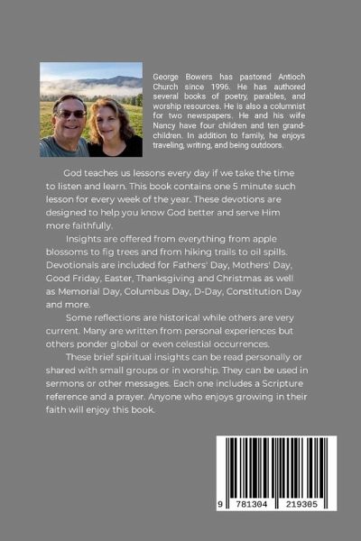 Blessings Volume V is a collection of 5-7 minute parable devotionals. Inside are lessons about God from everything from apple blossoms to fig trees and from the Dead Sea to Monarch Butterflies. These brief reflections can be read personally for devotional time or shared in worship or sermons.
