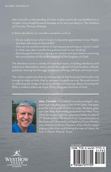 Alan Carruth's understanding of God's wisdom and truth was distilled into a simpler, more straightforward message as he was journaling on The Imitation of Christ by Thomas à Kempis. In these devotions, he considers questions such as: ¿ Do we really know what it means to become apprentices to our Master and learn the ways of eternal life? ¿ How can we commit ourselves to learning and practicing our Savior's ways? ¿ In what ways does humility bring divine truth to our thinking? ¿ Does any good come from arguing over opinions and speculations concerning the uncertainties of life at the expense of the kingdom of God? The devotions cover a variety of important topics, including obedience and submission, blessedness, misery, death, the judgment of God, burdens, solitude, gratitude, hearing God through Scripture, suffering, self-love, and much more. The author emphasizes that we must recognize that knowing God's truth is not enough to make us holy-that is, set apart for godly service. We must commit to reflecting the image of Jesus by loving and forgiving others. Knowing the Bible is useless unless we show others the grace and love of God.