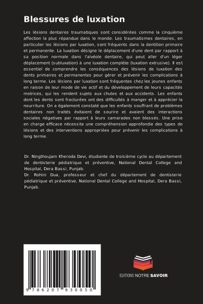 Les lésions dentaires traumatiques sont considérées comme la cinquième affection la plus répandue dans le monde. Les traumatismes dentaires, en particulier les lésions par luxation, sont fréquents dans la dentition primaire et permanente. La luxation désigne le déplacement d'une dent par rapport à sa position normale dans l'alvéole dentaire, qui peut aller d'un léger déplacement (subluxation) à une luxation complète (luxation extrusive). Il est essentiel de comprendre les conséquences des lésions de luxation des dents primaires et permanentes pour gérer et prévenir les complications à long terme. Les lésions par luxation sont fréquentes chez les jeunes enfants en raison de leur mode de vie actif et du développement de leurs capacités motrices, qui les rendent sujets aux chutes et aux accidents. Les enfants dont les dents sont fracturées ont des difficultés à manger et à apprécier la nourriture. On a également constaté que les enfants souffrant de problèmes dentaires non traités évitaient de sourire et avaient des interactions sociales négatives par rapport à leurs camarades non blessés. Une prise en charge efficace nécessite une compréhension approfondie des types de lésions et des interventions appropriées pour prévenir les complications à long terme.