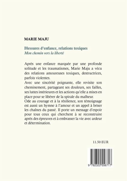 Après une enfance marquée par une profonde solitude et les traumatismes, Marie Maju a vécu des relations amoureuses toxiques, destructrices, parfois violentes. Avec une sincérité poignante, elle revisite son cheminement, partageant ses douleurs, ses failles, ses luttes intérieures et les actions qu'elle a mises en place pour se libérer de la spirale du malheur. Ode au courage et à la résilience, son témoignage est aussi un hymne à l'amour et un appel à briser les chaînes du passé. Il porte un message d'espoir pour tous ceux qui cherchent à se reconstruire après des épreuves et à embrasser la vie avec ardeur et détermination.